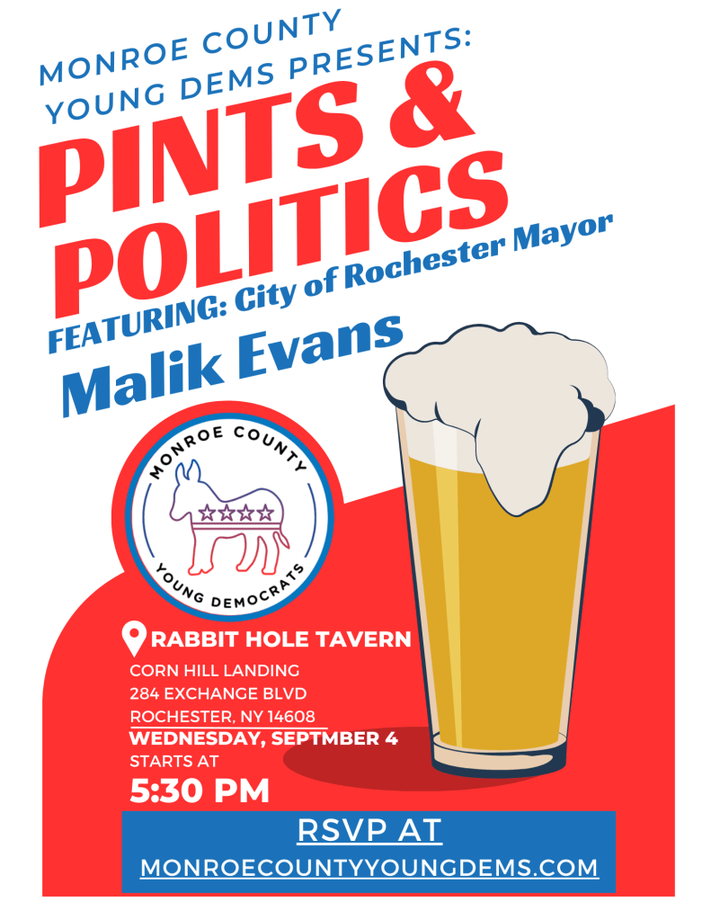 Join us for our 3rd edition of Pints and Politics featuring City of Rochester Mayor Malik Evans! This is a FREE event with the opportunity to learn about a community leader who has committed his career to improving the lives of our Rochester community members. We will also have a Q&A portion and an opportunity to network with the Mayor and other young Democrats! Please RSVP by completing the form here.
