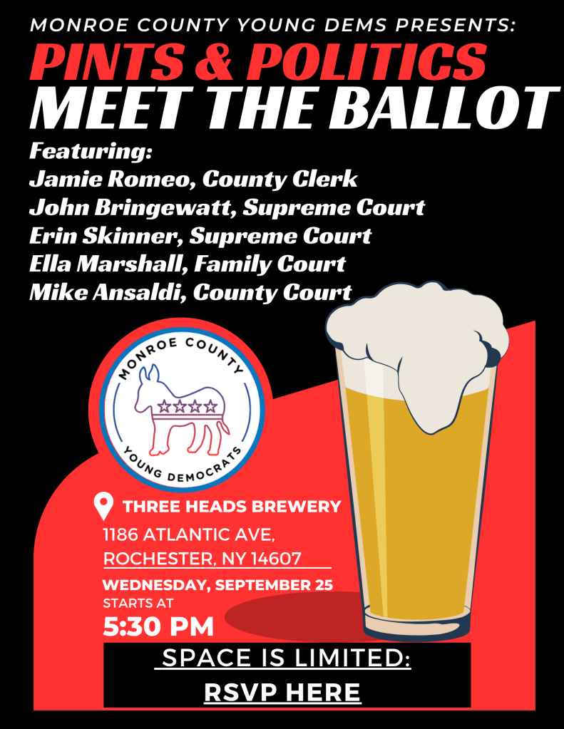 Pints & Politics Meet the Ballot on 9/25: Join us for a Pints and Politics: Meet the Ballot Edition! This event is free and will include: Jamie Romeo, County Clerk Ella Marshall, Family Court Mike Ansaldi, County Court John Bringewatt, Supreme Court Erin Skinner, Supreme Court Join us for a drink and to meet some of the amazing democrats on the ballot this year! Please RSVP by filling out this form.