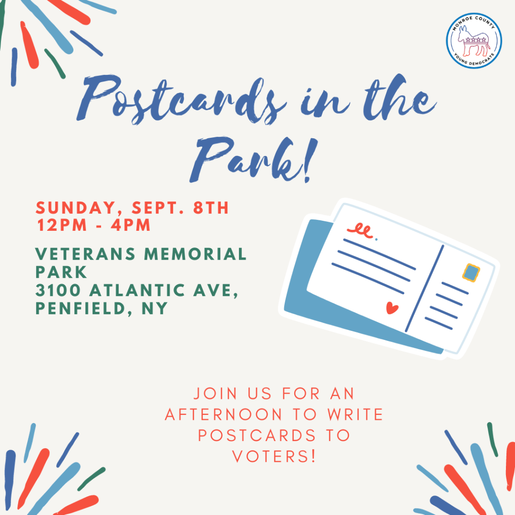 Postcards at the Park on 9/08:Join us on Sunday, September 8th at 12:30pm for a “Postcards in the Park” event at Veterans Memorial Park behind the Penfield Town Hall. We will write postcards to swing states and competitive congressional districts in NYS. As local campaigns have postcards available, we will be including them as well! We will have some snacks and water available. If you are unable to attend but would like to contribute, please donate to cover the cost of postage using this link.